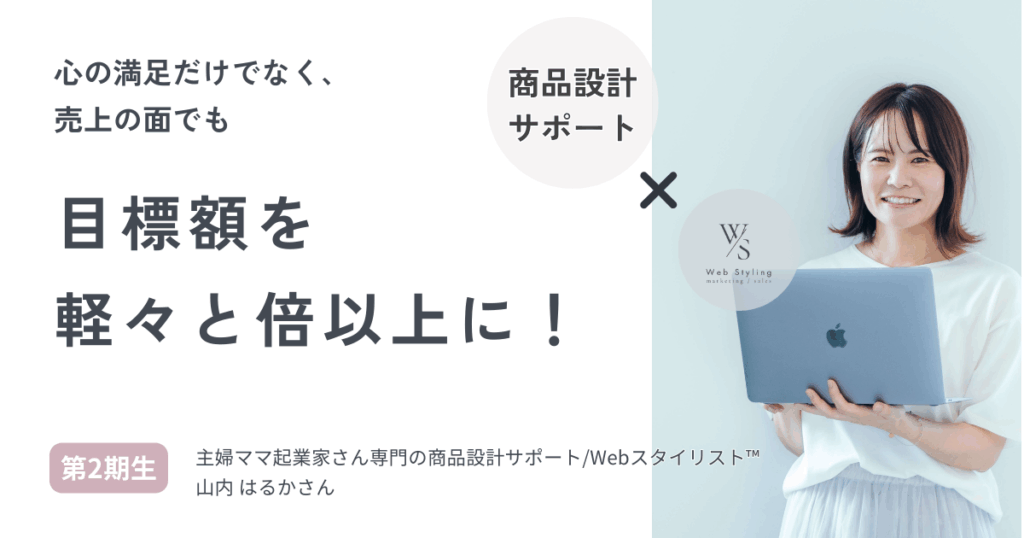 主婦ママ起業家さん専門の商品設計サポート/Webスタイリスト™︎ 山内 はるかさん 受講前の私 開業届けを出して1年目。起業初期の女性起業家さん向けにWebデザインサービスを提供していました。ホームページ制作やWebツールの画像制作を行う中で、お客様から...