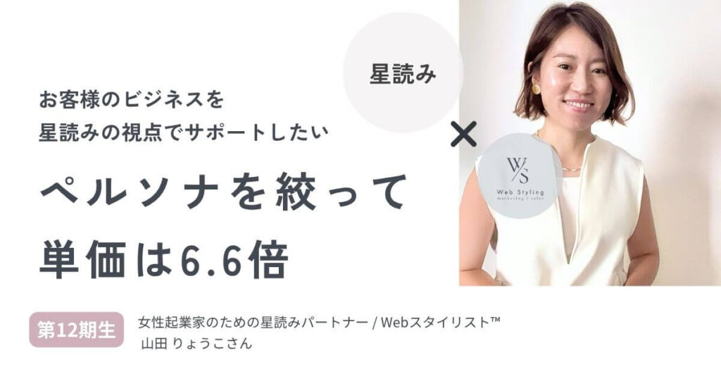 山田りょうこさん・女性起業家のための星読みパートナー ①Webスタイリング講座を受けようと思った理由 2024年4月に初受講、起業して1年が経った頃でした。「星読み師としてもっと成果を上げていきたい」という想いで1年間一人で走ってみたものの、思う... -